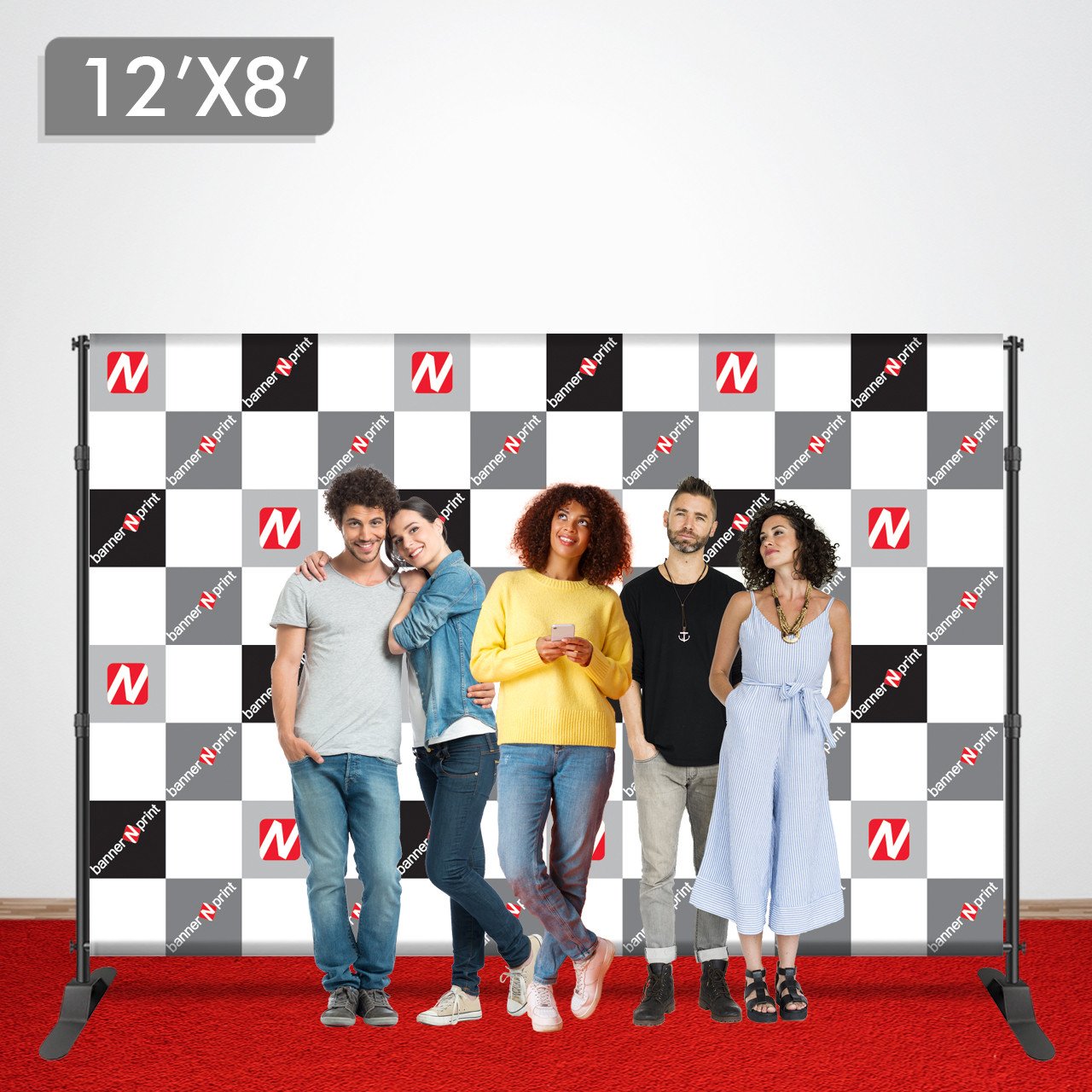 The most popular sizes for the step and repeat is 8×8 (8 by 8) and 10×8 (10 by 8). The 8×8 backdrop is ideal for 2 to 4 people and the 10×8 is perfect for 4 to 6 people.
