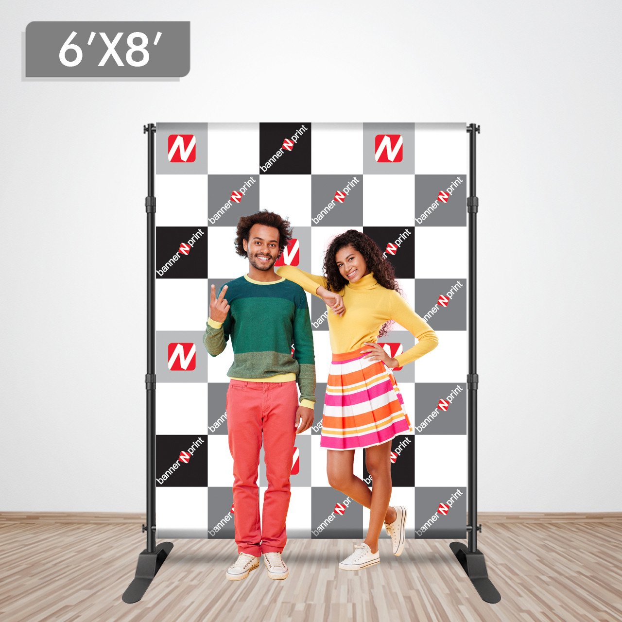 The 6×8 (6 by 8) backdrop is perfect for 2 to 3 people. It’s just right for those who want to maximize the entrance of any business and/or event. It is easy to store a box and will not take up much room. The 6×8 banner allows you to place the perfect amount of logos/sponsors. This option allows you to use the free-standing banner stand that is made for the 6×8 backdrop. This stand would give you the option to use this banner wherever you feel fit! The easy-to-assemble parts come with instructions on how to set up the banner and stand.